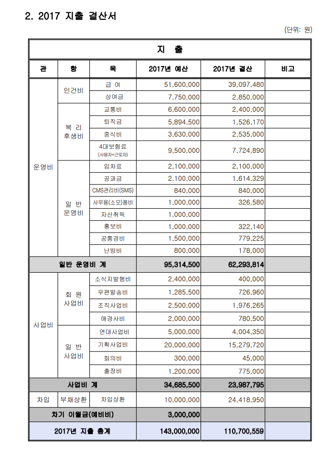 2017년 연간 기부금 모금액 및 활용실적 명세서, 수입지출 결산 보고