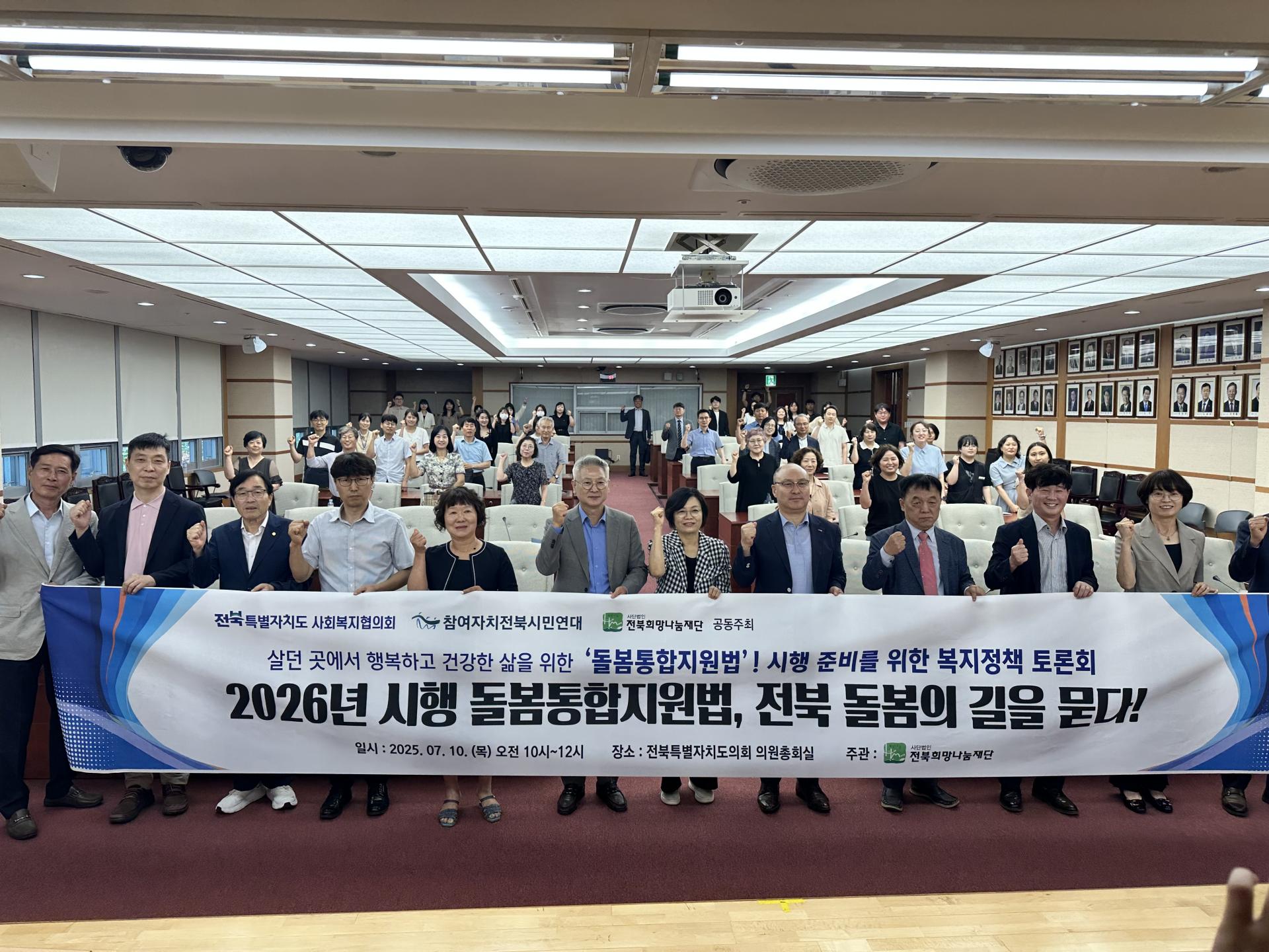 (사)전북희망나눔재단은 전북특별자치도사회복지협의회, 참여자치전북시민연대와 공동으로 전북특별자치도의회 의원총회실에서 2024년2월에 제정되고 2026년 3월 27일 시행을 앞두고 있는 ‘의료 요양 등 지역돌봄의 통합지원에 관한 법률’(약칭: ‘돌봄통합지원법’) 시행 준비를 위한 복지정책 토론회’를 <‘2026년 시행 돌봄통합지원법’, 전북 돌봄의 길을 묻다!>라는 주제로 개최하였다.